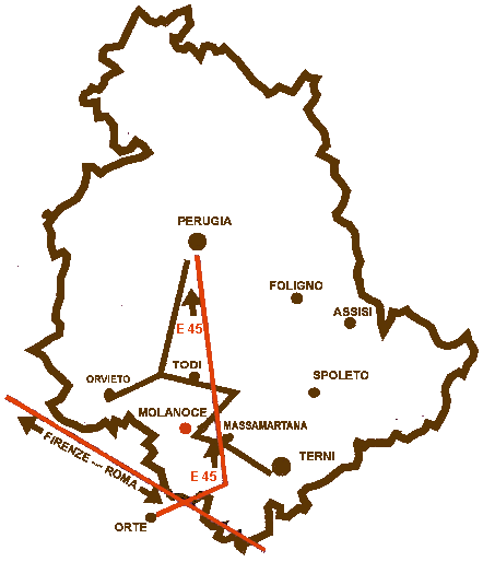 Per raggiungere il ĞMOLINO DI MOLANOCEğ: Uscita autostrada ad Orte, si prende la E45 per Perugia-Cesena e si lascia all'indicazione Massa Martana. Dopo 50 metri si gira a sinistra lungo la provinciale per Todi. Percorsi 200 metri si arriva al Molino di Molanoce.